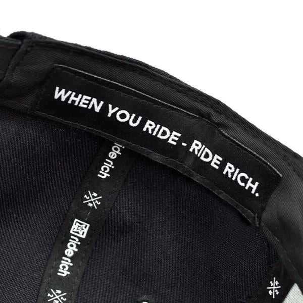The Ride Rich Script Snapback is constructed of 70% Acrylic / 30% Wool with our custom embroidery on the front panel and both sides.