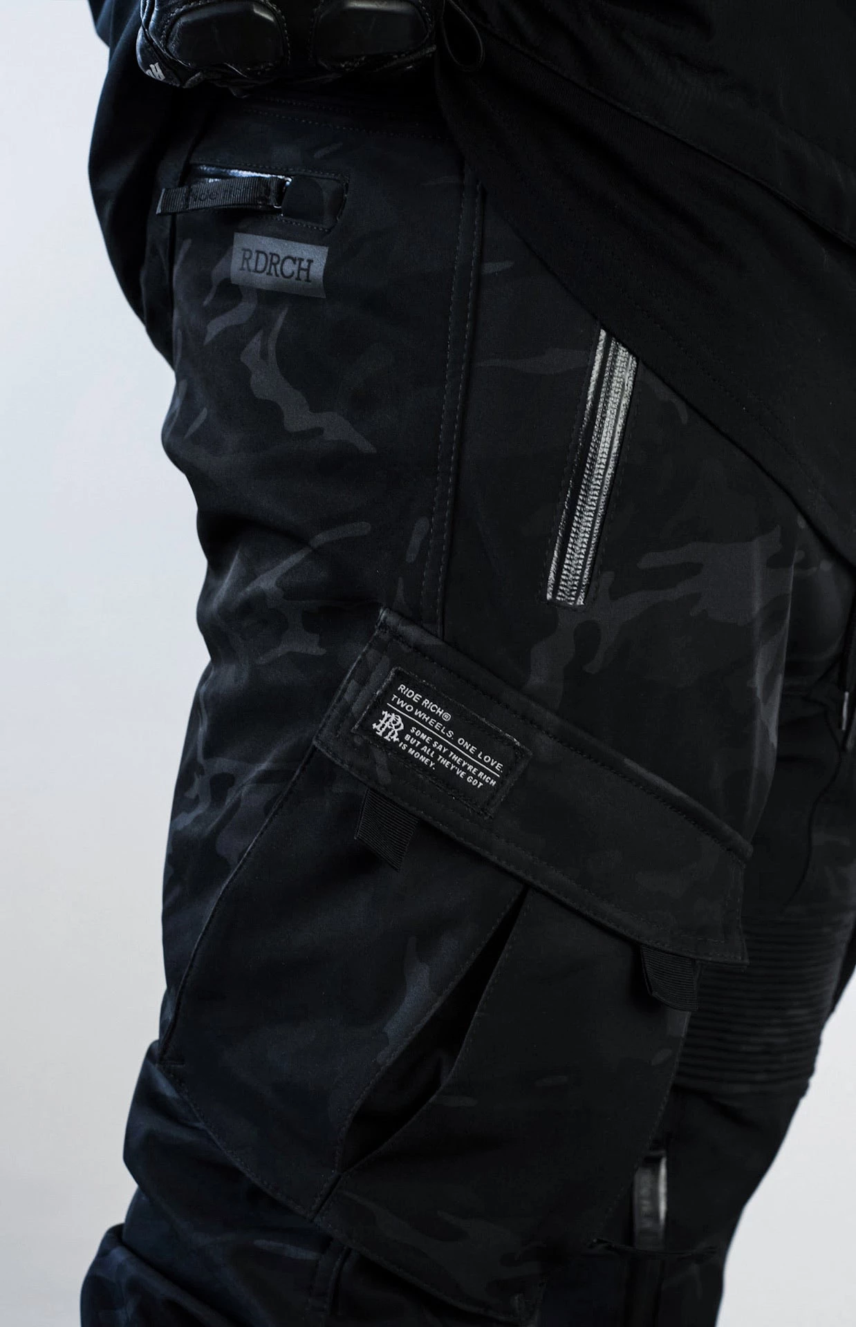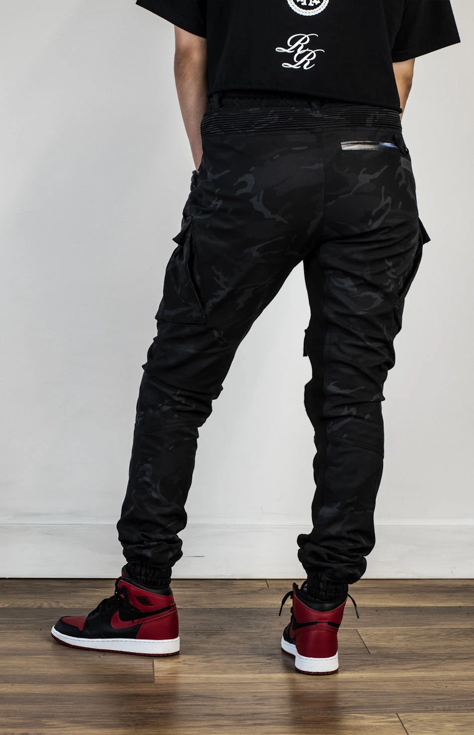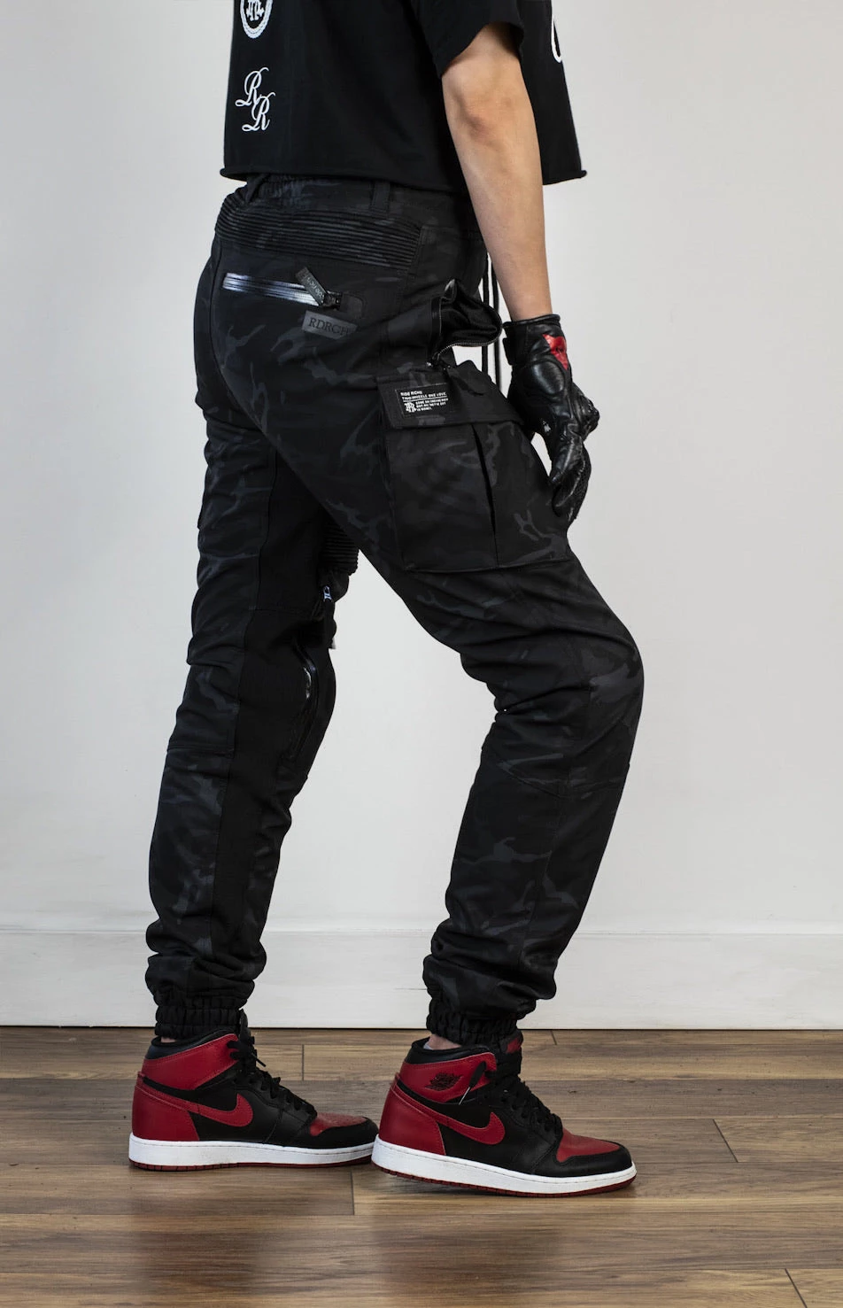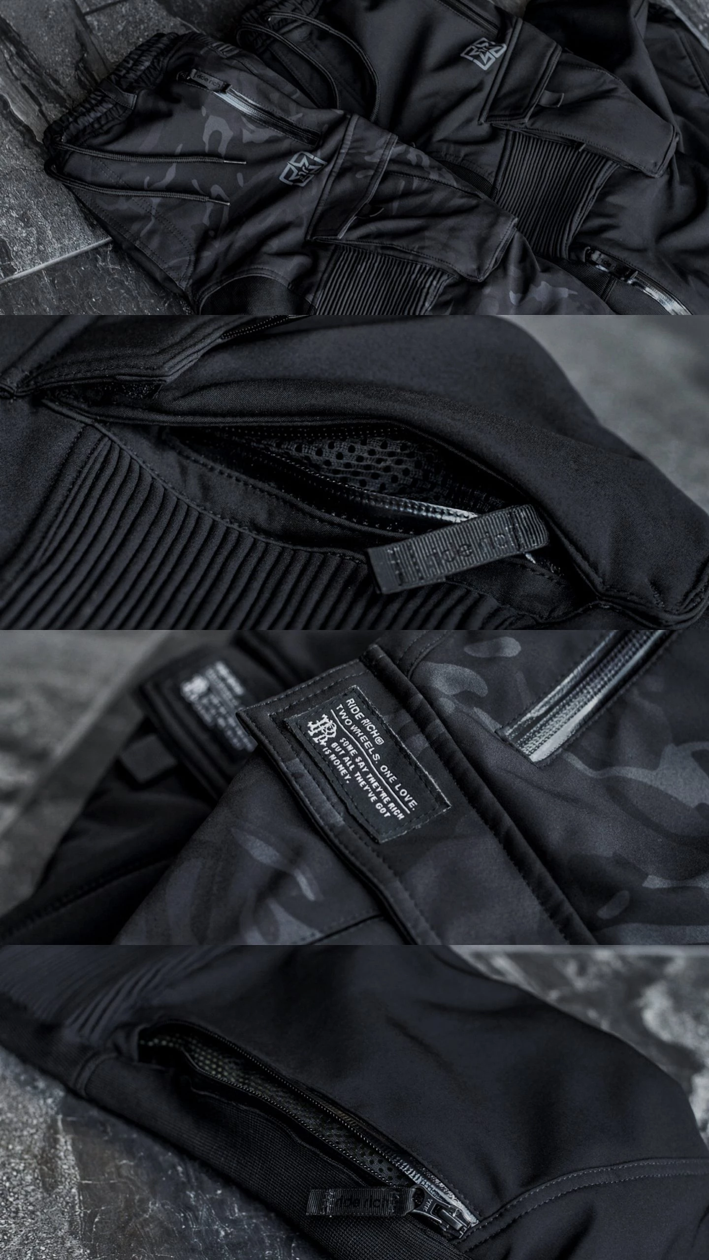 - Stretch ribbing on rear waistband, thighs and ankles