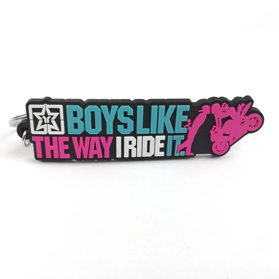 Precision cut 2D Keychain with Split Key Ring. Constructed of PVC plastic with a rubber like feel that won’t scratch up your bike.