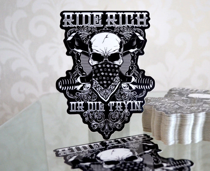 Our Ride Rich Vinyl Stickers are high-quality printed with a high-gloss, weather and UV-resistant coating that allow them to last in indoor and outdoor conditions for years without fading, cracking or peeling.
