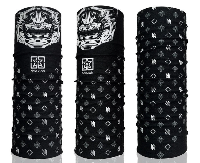 Our Exclusive Rich Wrap is constructed of 100% Polyester Microfiber, it’s breathable, moisture-wicking and features multiple ways to wear it. The Seamless Tubular Bandana Design allows wearing without creating pressure points or headaches. Custom artwork consists of a Ride Rich Pattern and Samurai Mask like no other.
