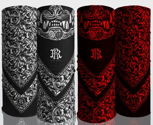 Our Exclusive Rich Wrap is constructed of 100% Polyester Microfiber, it’s breathable, moisture-wicking and features multiple ways to wear it. The Seamless Tubular Bandana Design allows wearing without creating pressure points or headaches. Custom artwork consists of a Ride Rich Pattern and Savage Mask like no other.