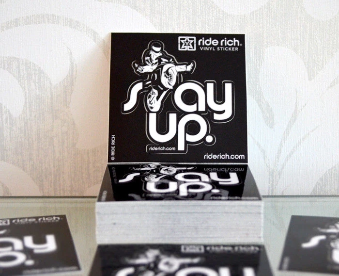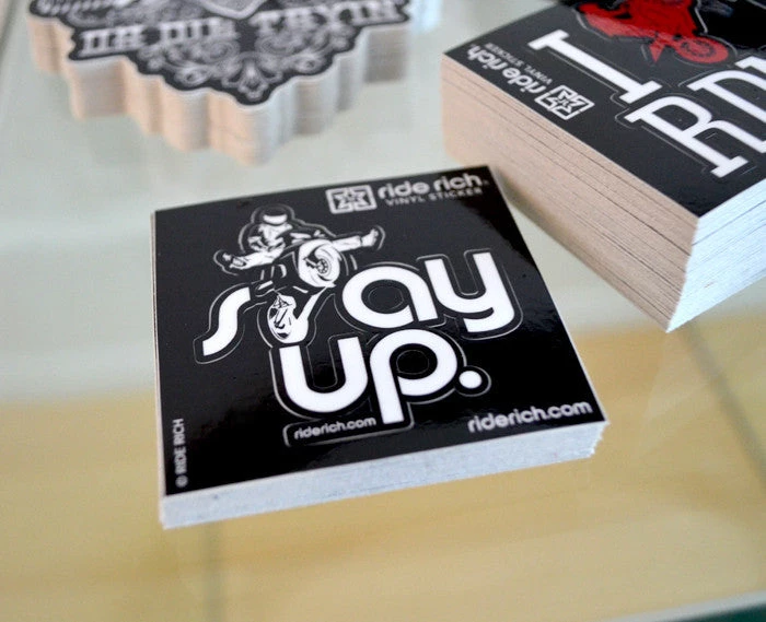 Our Ride Rich Vinyl Stickers are high-quality printed with a high-gloss, weather and UV-resistant coating that allow them to last in indoor and outdoor conditions for years without fading, cracking or peeling.