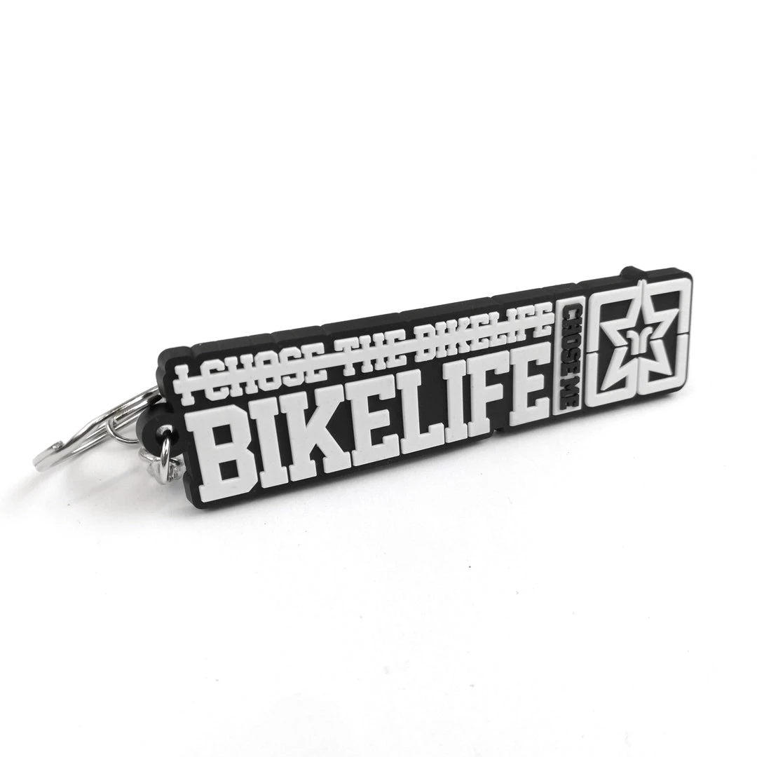 Precision cut 2D Keychain with Split Key Ring. Constructed of PVC plastic with a rubber like feel that won’t scratch up your bike.